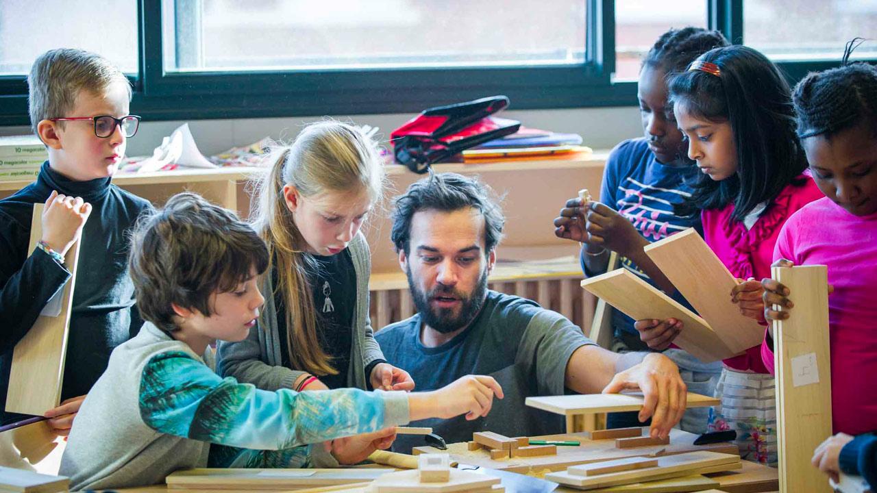 Caroline Ziegler et Pierre Brichet, du studio BrichetZiegler, tous deux professeurs à l’école Camondo, ont spécifiquement imaginé dix objets répondant à un cahier des charges exigeant : une lampe en cuir, un porte-monnaie animal, une trousse, un porte-documents, une lampe en bois, un haut-parleur pour téléphone portable, un tabouret, une caisse à outils, un pouf ottoman et un coussin ghetto-blaster. Un carnet de bord est remis à chaque élève pour l’accompagner dans la compréhension des matières, des outils et des gestes techniques nécessaires. Si l’objet fini est un objectif, chaque étape de sa fabrication constitue également une promesse de rencontres, de découvertes et de plaisir de faire. Et à l’issue du cycle, l’élève conserve l’objet qu’il a lui-même réalisé.