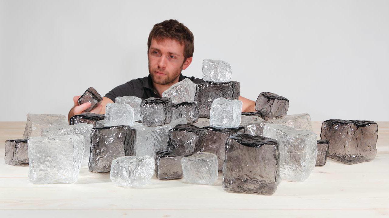 En résidence à la Cristallerie Saint-Louis, en Moselle, Olivier Sévère (France, 1978) se concentre sur l’étude des matières, l’exploration de leur nature, de leur chimie et de leurs contraintes physiques. Jouant avec le cristal et les multiples formes que lui a fait prendre le travail des verriers à travers les siècles, l’artiste parrainé par Emmanuel Saulnier imagine l’œuvre De rien ne se crée rien. Chaque pièce réalisée avec les artisans fait appel à différents métiers du travail du cristal, à chaud et à froid. En détournant certains effets caractéristiques pour réaliser plusieurs ensembles de “pierres”(galets, pavés, ardoises, roches…), il reconstitue un cycle perpétuel de la matière. La roche se délite en sable, lui-même utilisé dans la composition du cristal qui sera exploité pour reproduire l’aspect des pierres…