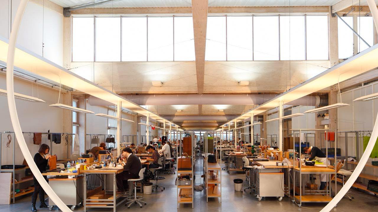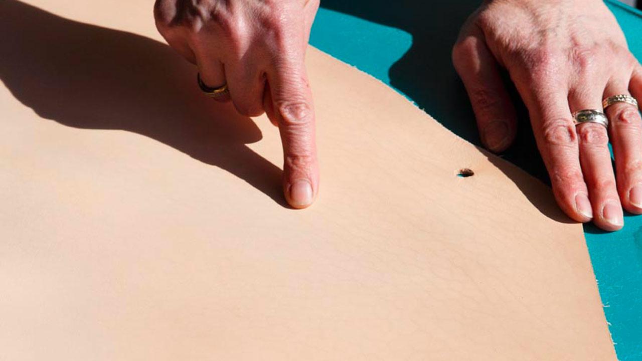Dès son arrivée à la Maroquinerie de Sayat, en Auvergne, Elisabeth S. Clark (Angleterre, 1983) est immédiatement frappée par les gestes des artisans au travail. L’artiste parrainée par Susanna Fritscher les associe spontanément à une danse, s’arrêtant tout particulièrement sur un mouvement circulaire exécuté lors de la couture du point sellier. Son observation attentive lui inspire l’élaboration d’un cercle de bois de quatre mètres de diamètre, entièrement gainé de cuir blanc. Installé à la verticale dans l’atelier, il offre un cadre circulaire aux scènes qui se jouent au quotidien. Une simple ligne se trace dans l’espace et oriente le regard. L’œuvre propose ainsi un focus sur la dextérité maîtrisée des gestes des artisans, un geste sur le geste.